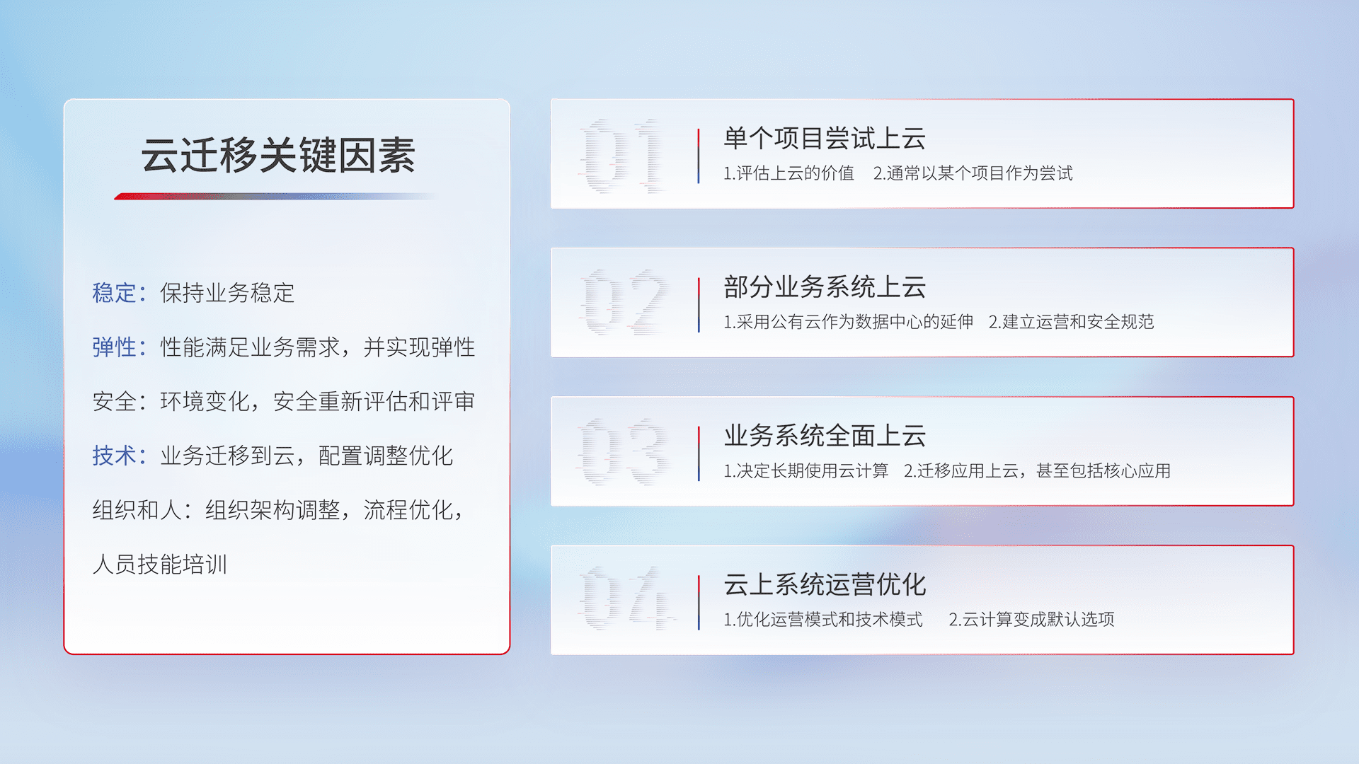 结合实际业务,,从规划设计、、、云平台选型、、、、云原生改造、、、、数据迁移、、集成交付,,,,迁移全过程为客户识别最佳上云路径,,,做好风险识别管理,,设计网络架构、、身份权限、、安全审计合规、、操作审计、、日志审计、、监控告警策略、、、、多站点容灾设计等,,对云上基础设施进行整体规划,,,,提升IT治理水平,,,,以满足弹性、、高可用、、、高性能的需求。。。