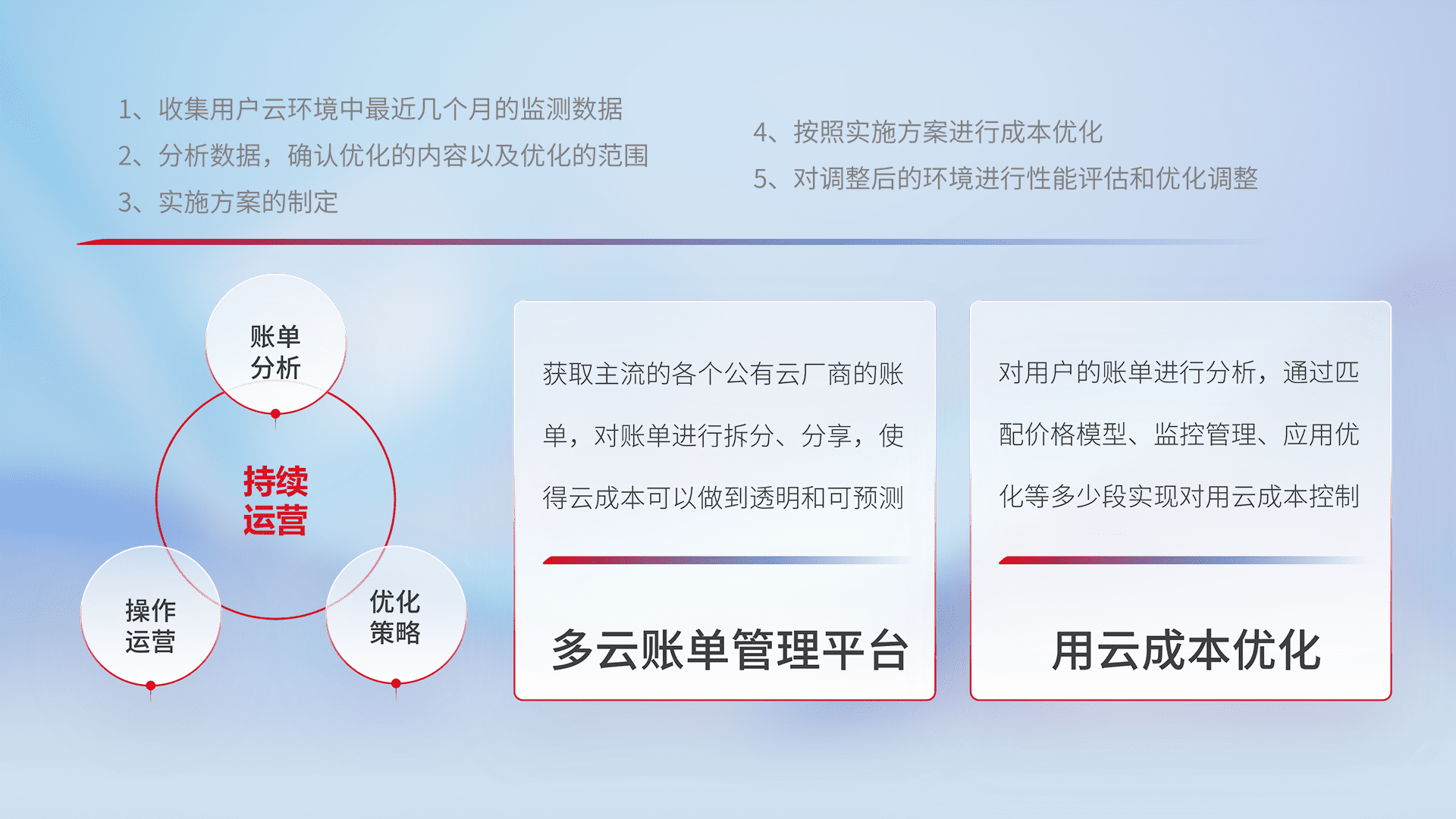 通过多云纳管,,,以统一的资源数据模型把客户的云资源进行抽象和封装,,,进而实现对多云资源的统一操作,,,保障云资源管理的可靠性、、、稳定性与可用性。。。量身定制化运维内容,,配置、、、、开发运维、、、、补丁管理、、、、备份、、、监控、、认证和访问管理、、审计和日常巡检等,,保障在用云过程中的可靠度,,,稳定度以及高可用率。。。