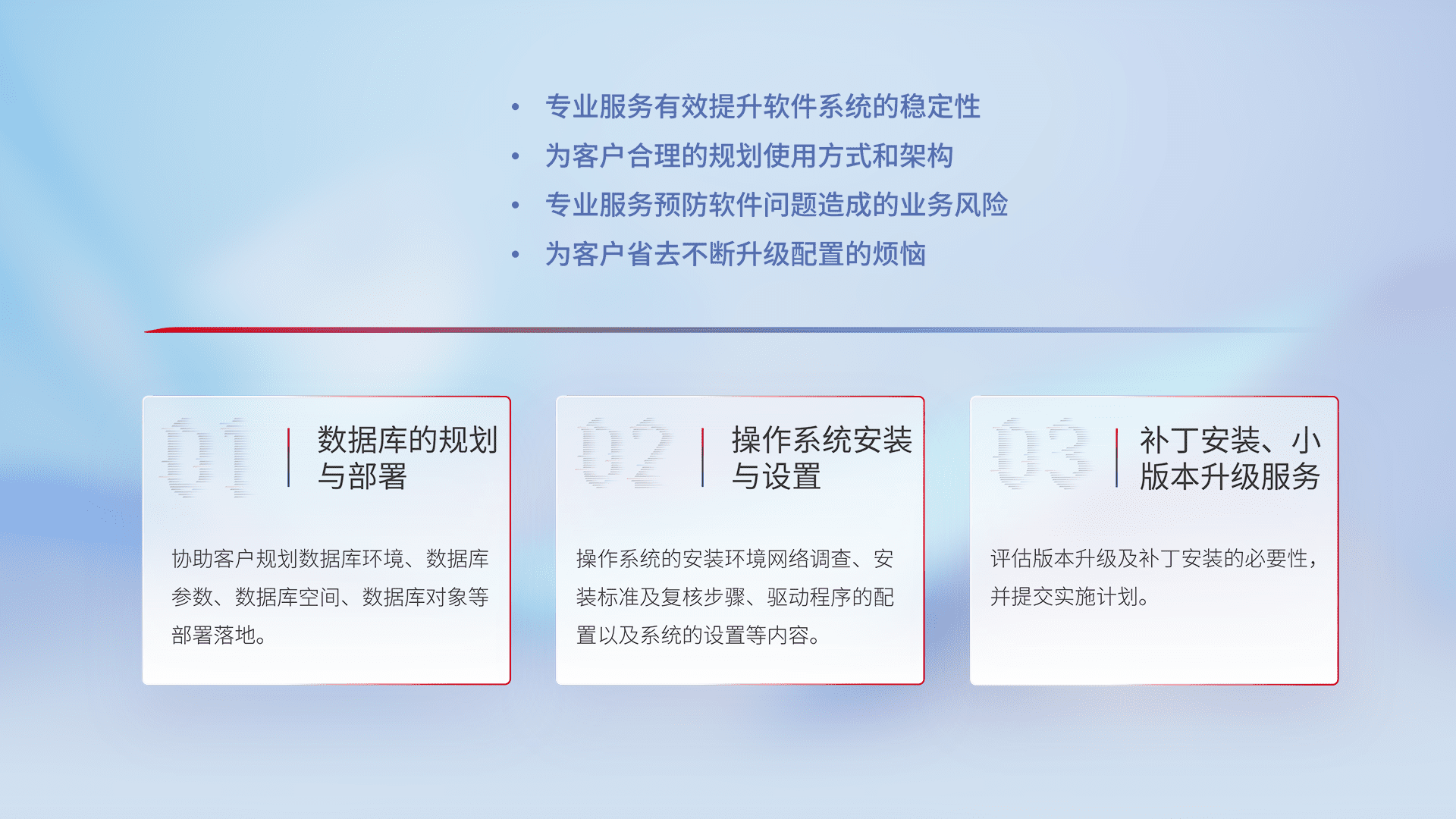 为客户提供软件规模升级、、、、快速部署、、按需配置的专业服务,,从数据库的规划与部署到操作系统的安装与设置,,,,再到补丁安装和小版本升级提供支持。。